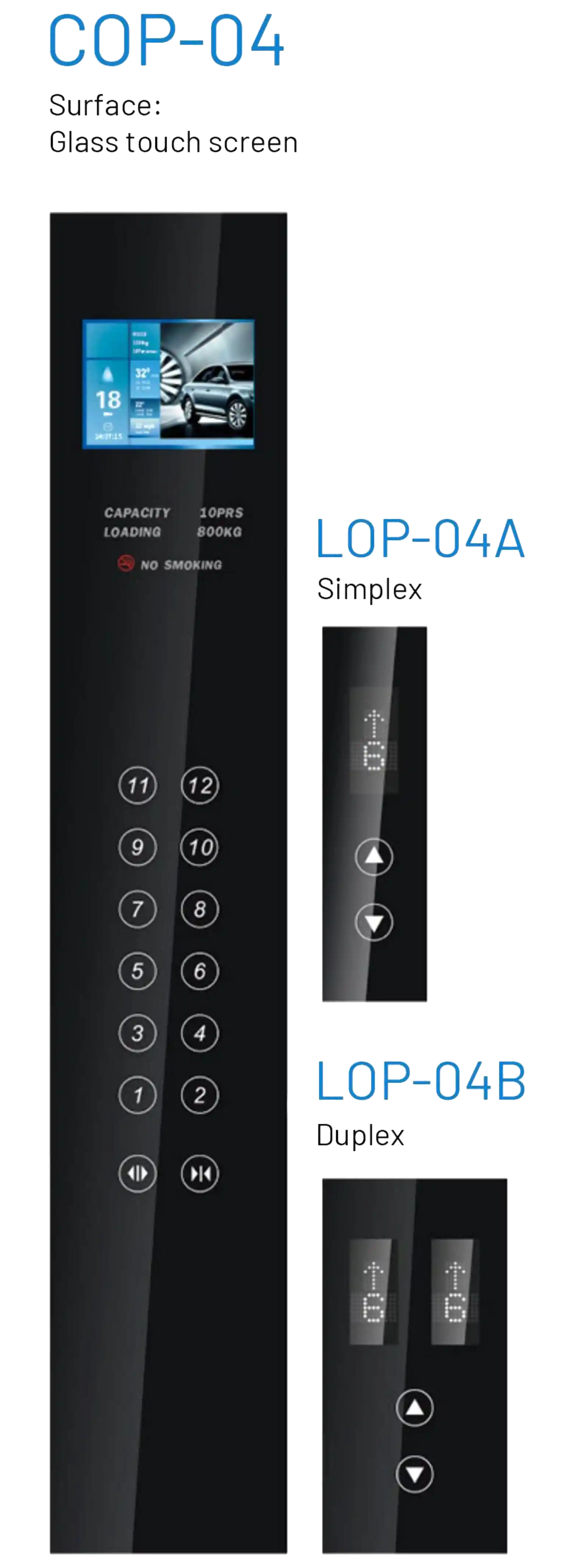 Floor Buttons: Allow passengers to select their desired floor. Door Controls: Buttons to open or close the elevator doors. Emergency Buttons: Include alarm, emergency stop, and communication buttons. Displays: Show current floor, direction of travel, and other operational information.